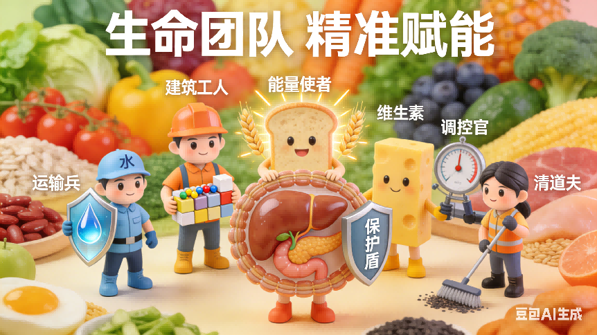 人体由40-60万亿个细胞构成,维持细胞活力的核心,是七大必需营养素的均衡供给,它们如同分工明确的“生命团队”,各司其职筑牢健康防线: